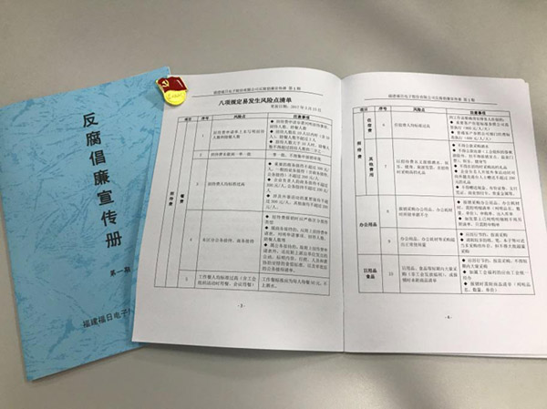 結合“兩學一做”學習教育常態(tài)化制度化,2017年上半年以來,福日電子黨委、紀委多形式多種渠道深入開展全面從嚴治黨教育。一是組織收看專題教育片《永遠在路上》,利用鮮活的案例教育和引導廣大黨員防微杜漸、警鐘長鳴;二是利用公司廉潔教育微信群平臺,不定期向企業(yè)中層以上領導干部及黨員推送教育警示文章,開展微黨課教育,提醒督促領導干部及黨員以身作則,嚴守“廉潔關”;三是在重要節(jié)假日等關鍵節(jié)點下發(fā)通知文件,持續(xù)重申中央八項規(guī)定精神和廉潔從業(yè)等有關紀律要求,及時開展自查自糾,廉潔過節(jié);四是編印《反腐倡廉宣傳冊》,涵蓋遵守八項規(guī)定風險點、廉潔從業(yè)應知應會知識及行為規(guī)范、違紀案件警示錄等內(nèi)容,使廉潔教育知識隨時可學可查,讓反腐倡廉真正融入廣大黨員、干部、職工日常工作、生活。