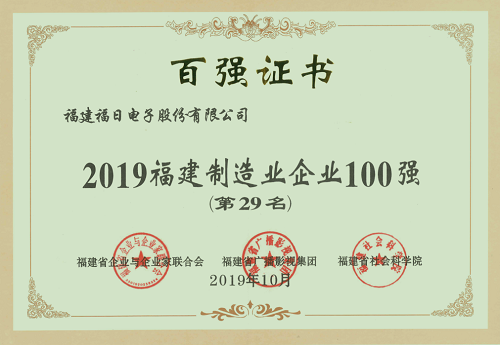 2019年10月24日,由福建省企業(yè)與企業(yè)家聯(lián)合會、福建省社會科學(xué)院、福建省廣播影視集團(tuán)共同舉辦的2019年福建企業(yè)100強(qiáng)研究發(fā)布會在福建漳州舉行,福建福日電子股份有限公司入選2019福建制造業(yè)企業(yè)100強(qiáng)。福日電子總裁溫春旺受邀參會。