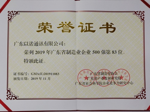 2019年11月13日,由廣東省制造業(yè)協(xié)會(huì)、廣東省產(chǎn)業(yè)發(fā)展研究院、廣東省社會(huì)科學(xué)院企業(yè)競爭力研究中心共同主辦的2019廣東省制造業(yè)發(fā)展年會(huì)暨廣東制造業(yè)500強(qiáng)企業(yè)峰會(huì)在廣州隆重舉行,會(huì)上發(fā)布了2019年廣東省制造業(yè)500強(qiáng)企業(yè)研究報(bào)告,福日電子二級(jí)控股子公司廣東以諾通訊有限公司榮列2019年廣東省制造業(yè)企業(yè)500強(qiáng)第83位。