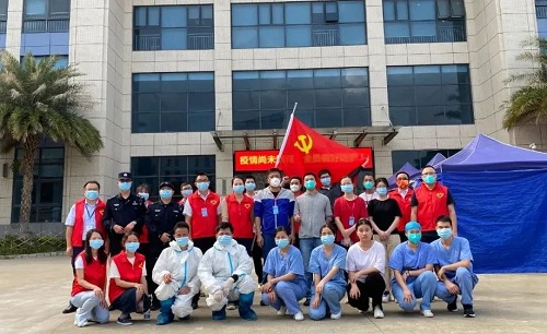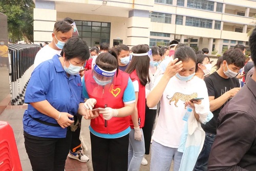從早上8點(diǎn)半起,周邊企業(yè)的員工們就分批來(lái)到等待區(qū)域。“請(qǐng)往這里走?!薄奥闊┏鍪疽幌滦谐檀a?!币荒ò咨c紅色交織的身影,正在進(jìn)行現(xiàn)場(chǎng)分流引導(dǎo)、幫忙查詢行程,他們正是由邁銳光電黨支部黨員和入黨積極分子組成的7人志愿者隊(duì)伍。在他們的助力下,現(xiàn)場(chǎng)每個(gè)步驟環(huán)環(huán)相扣、有條不紊,在當(dāng)日16時(shí)即完成全部6500余人的核酸檢測(cè)工作,讓黨旗在防疫一線高高飄揚(yáng)。