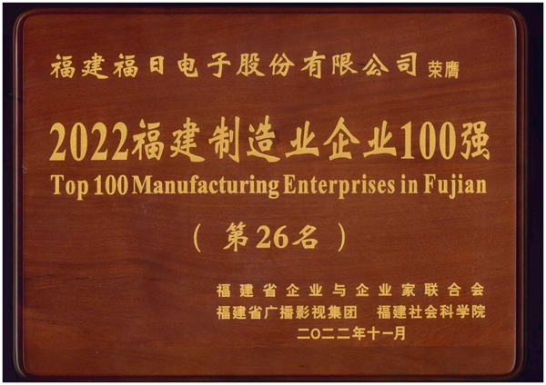 12月7日下午,2022福建企業(yè)100強發(fā)布大會在莆田舉行,會上發(fā)布了“2022福建企業(yè)100強”“2022福建制造業(yè)企業(yè)100強”“2022福建服務(wù)業(yè)企業(yè)100強”“2022福建戰(zhàn)略性新興產(chǎn)業(yè)企業(yè)100強”4個榜單。福建福日電子股份有限公司連續(xù)4年入圍福建制造業(yè)企業(yè)100強,位列第26名,較去年提高8個位次,排名再創(chuàng)新高。這是繼該公司今年首度入圍“中國制造業(yè)企業(yè)500強”后的又一重大突破。