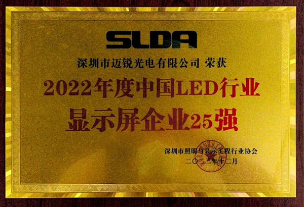 再次獲得“2022年度中國LED顯示屏行業(yè)25強(qiáng)企業(yè)”獎項(xiàng),體現(xiàn)了行業(yè)對邁銳光電在過去一年在顯示科技水平以及項(xiàng)目設(shè)計(jì)方案等方面所取得成績的高度認(rèn)可,尤其是在顯示科技水平和項(xiàng)目設(shè)計(jì)方案方面,贏得了業(yè)界的廣泛贊譽(yù)。